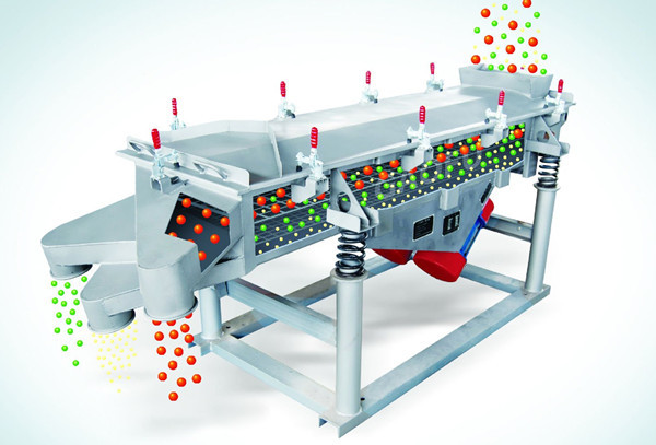 直線振動篩利用振動電機激振作為振動源,使物料在篩網(wǎng)上被拋起,同時向前作直線運動,物料從給料機均勻地進入篩分機的進料口,通過多層篩網(wǎng)產(chǎn)生數(shù)種規(guī)格的篩上物、篩下物、分別從各自的出口排出。具有耗能低、產(chǎn)量高、結(jié)構(gòu)簡單、易維修、全封閉結(jié)構(gòu),無粉塵溢散,自動排料,更適合于流水線作業(yè)。